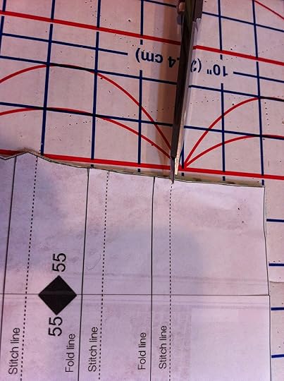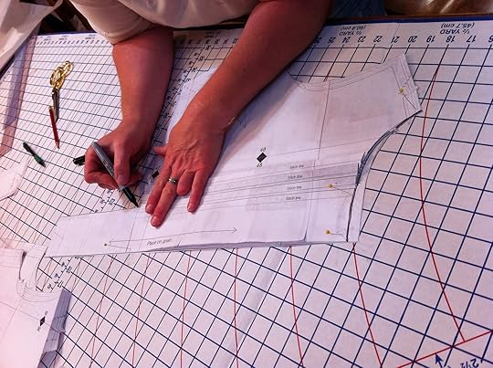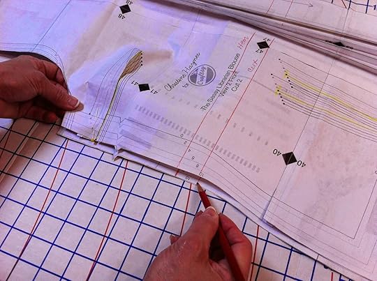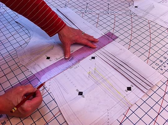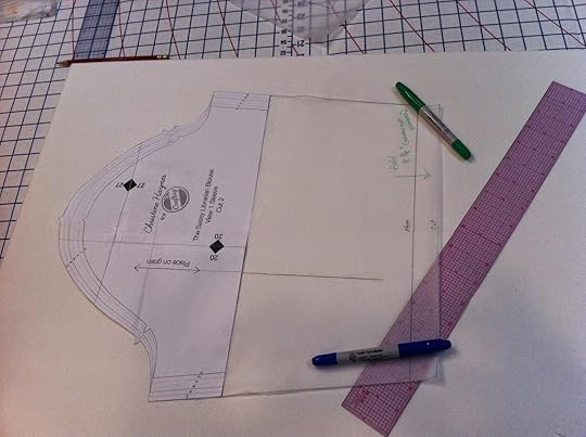 Cutting this one into a short jacketUsing my bust point as a guide for length, I decide to cut off 7 7/8" from the bottom of the pattern. I am using my grid to draw a cut line perpendicular to the grain line. Draw a line 1" above for your hem mark.