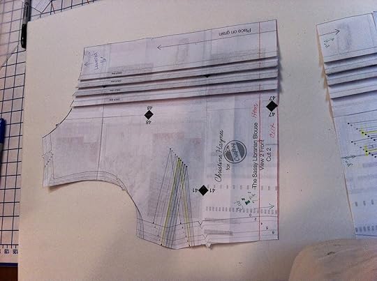Transferring the new neck line to pattern frontBecause I knew the neck would be too high for my liking, using the pattern front without the tucks, I lowered the neck at center front by 1/2"redrawing a new line from the shoulder. (I used that pattern to keep all those tucks from getting in my way.) With the tucks closed, I transferred that new line to the view with the tucks.