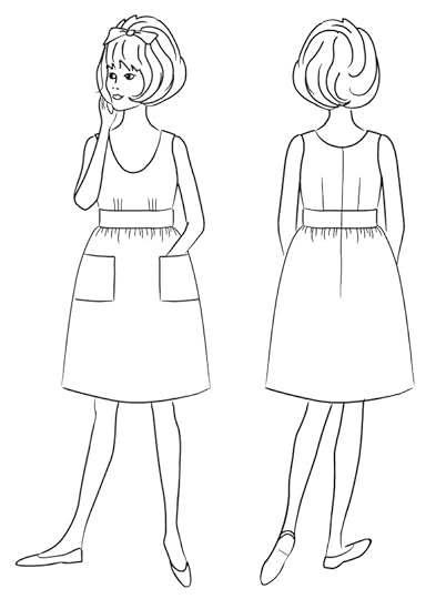 View A is the ultimate picnic dress, which is why I simply had to make one of the samples in gingham. The bodice has a deep scoop neck, sleeveless armholes, darts up the back for fitting, and an invisible zipper in the center back. Under the bust are three small darts, which lends a feminine touch to the shape. Under the bust seam is a wide waistband, and it's all topped off with a full dirndl skirt and large rectangle patch pockets.