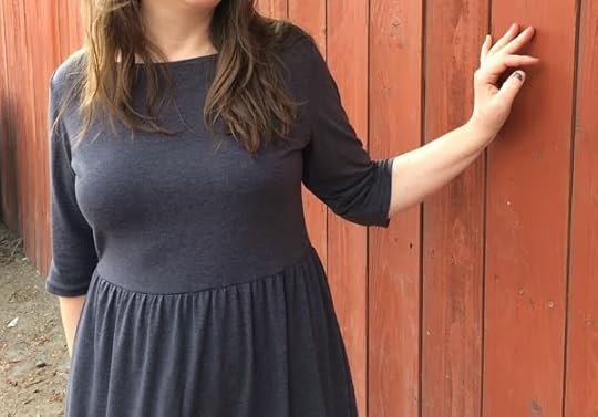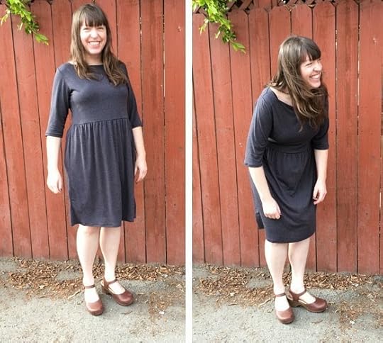 Sometimes I want to wear my jammies to work, so last week I decided to make up a knit dress to wear the next day, because well, I wanted to wear jammies! I pulled out my Built by Wendy Sew U Home Stretch book and followed the boatneck top tutorial for the top of the dress. Then for the bottom, I simply cut two rectangles to be gathered up.