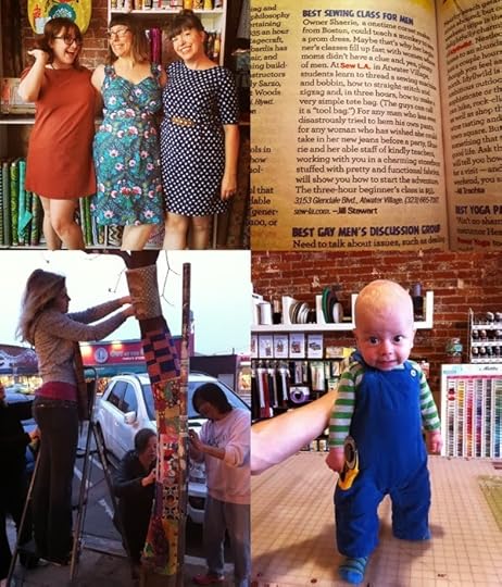 Top row left: Haley, Shaerie (Sew L.A.'s owner), and myself, all in Colette Patterns Dresses!Top row right: Thanks to LA Weekly for naming us the best place to learn to sew (for men & more)!Bottom row left: The Bearding Ladies quilt bomb our tree!Bottom row right: Training Shaerie's son Lux on how to safely use the rotary cutter!