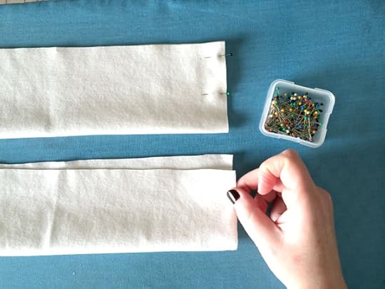 You should have two cuff pieces, one for each arm. Fold each cuff piece in half, right sides together, lining up the short ends. Pin the two short ends on each cuff piece.