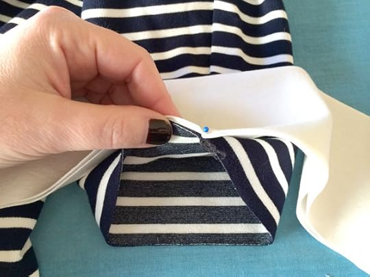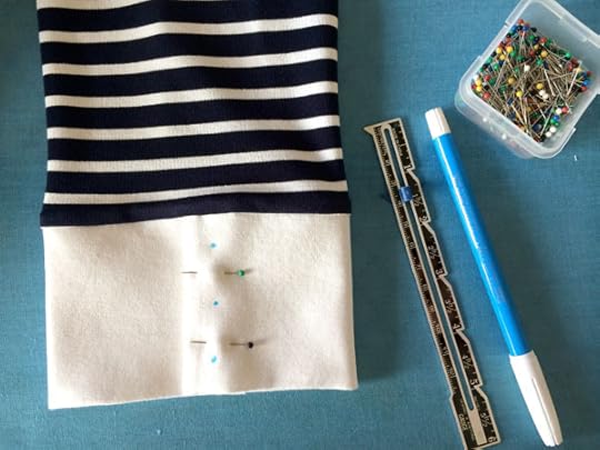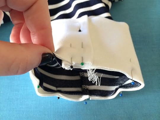 Roll the cuff piece around the sleeve hem, continuing to line up the raw edges and pinning in place. Stop about 2" before the notch on the sleeve on either side, opposite the seam on the sleeve, so the section around the notch is unpinned.