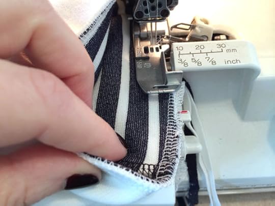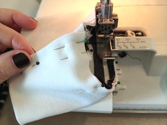 Do not slip the sleeve opening over the free arm of your machine, unless it does so with lots of room to spare. You don't want it stretching while sewing! If you cannot fit it on your arm, sew it from the inside as pictured above. Like when attaching the neck binding, you will be sewing in a circle, so be careful to start into the fabric at a slight angle.