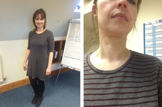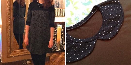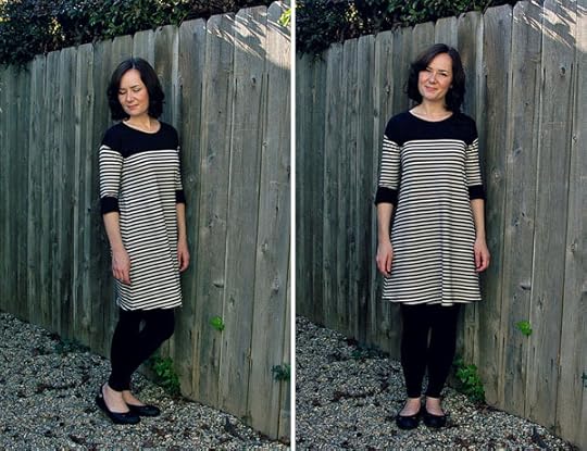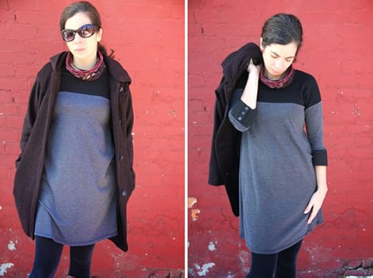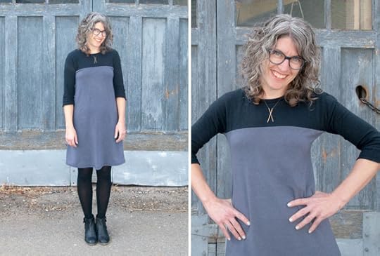 Claire made a cozy gray and burgundy striped hybrid of View A dress with View B sleeves. I love how everyone is customizing the views to suit their tastes. I hoped this would happen, but one never knows if that would happen or not. And look at that perfect stripe line up on the neck binding! Well done Claire!