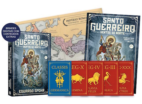 • Os quatro primeiros capítulos do livro (PDF)• Pôster A3 com a capa de “Santo Guerreiro: Roma Invicta” (PDF)• Pôster A3 com a capa de “Santo Guerreiro: Ventos do Norte” (PDF)• Mapa do Império Romano no Terceiro Século (PDF)• Mapa do Império Romano sob a tetrarquia (PDF)• 10 cards com as legiões