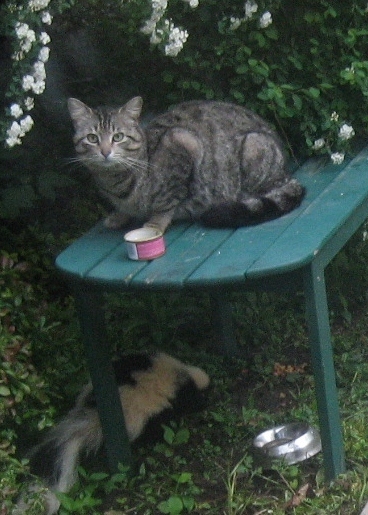 Here she is, having a snack the other day, while one of the cats waits his turn: