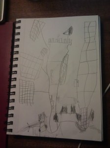 Well, Leo’s camp this morning was cancelled due to rain, which meant that my jealously-guarded 90 minutes of uninterrupted work time has gone out the window. I was able to work a little bit after I (with theatrics) got him on an imagination-fueled thought experiment about what it would be like to live in a colony on the moon, and what the buildings would need to look like and be made of, etc. He drew about seventeen pictures. Here is one of an observation tower: