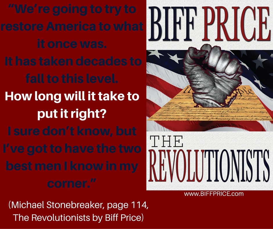 Where is Michael Stonebreaker when we need him? You’ll find him in the pages of The Revolutionists by Biff Price. Straight from today’s headlines, The Revolutionists presents an uncanny, almost surreal picture of America today, and it offers solutions to all our problems. It’s only fiction of course, but what if there were actually people in America as dedicated as the members of The Movement are in the book? What if there really is a man like Michael Stonebreaker somewhere in this great country? What then?