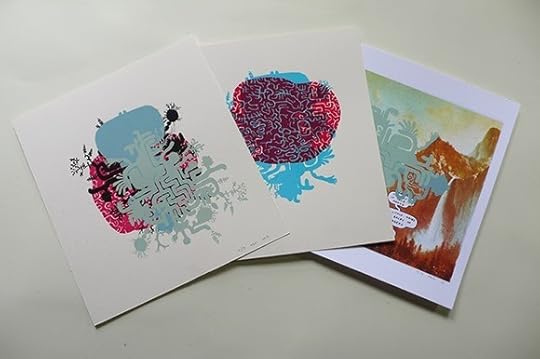 So now they're done. In the end the piece is more a collection of monoprints than an edition. None of the individual pieces is quite the same as any other. As I went along I also started using the discard pile as part of that screwing around process. And I liked those as much as the actual piece itself. So there's a test print included in each package with the real piece. It's like Crackerjacks.