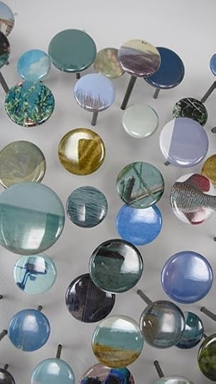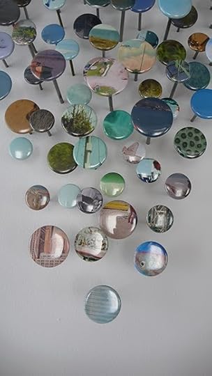 The piece was designed in consultation with NRDC. The Midwest chapter focuses on Great Lakes issues, so almost all the imagery comes from pictures of the Lakes. The overall design is inspired by diagrams of their relative volume and depth (in order of size: Erie, Huron, Ontario, Michigan, Superior). On the buttons themselves there are images of people fishing and swimming, images of fish, plants and cities on the shore, sunken wrecks, sailboats, ducks, and driftwood as well as plenty of images of the Lakes' surfaces in all sorts of light and weather.
