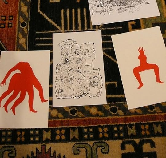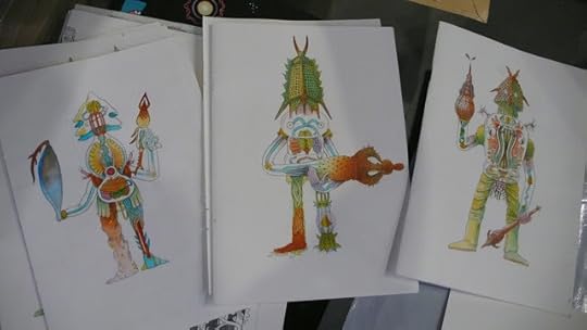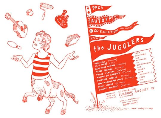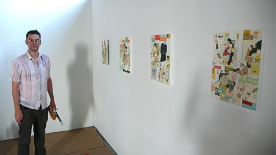 Two of the greatest non-comics comics shows the world has ever seen are being mounted as you read this. Come to the openings tomorrow, Tuesday, August 13th. The first two images are from Benoit Preteseille's ION show at Alliance Francaise (with a reception at 5pm, Tuesday). The rest are from The Jugglers at Co Exhibitions, opening at 7pm Tuesday, with a performance by Zak Sally's Pretty Ladies. Pictured are Marc Bell and Genevieve Castree helping hang their work (I'm kind of a slave driver), and selections from both, as well as three watercolor characters by Pierre Ferrero and some sculptures by Lilli Carre. Come say hello!