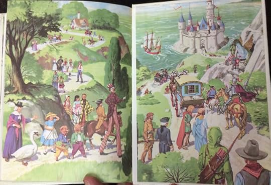 and here's a similar idea, but with non-copyrighted fantasy worlds. This was a book I found in a Portland antique shop. Three little pigs, meet Davy Crockett. Where the hell are they all going?