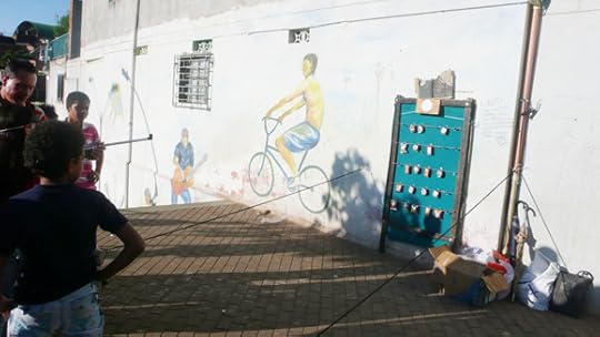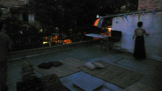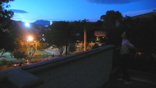 Okay, we're still on day one. But the evening. Mark and Vivi had us all over to their rooftop for a barbecue, with baby potatoes, masa cakes and all sorts of juicy little bits of meat to dip in various sauces. So good. this is as we arrived: Santiago, Karol, Fran Lopez and Sarah Glidden