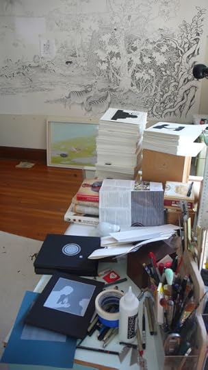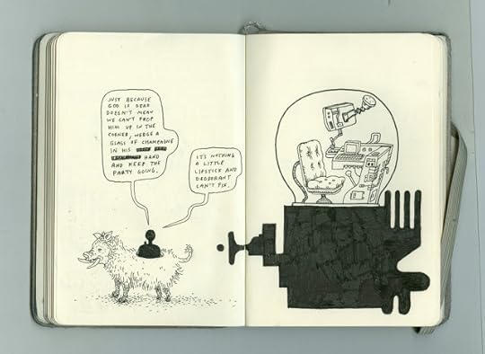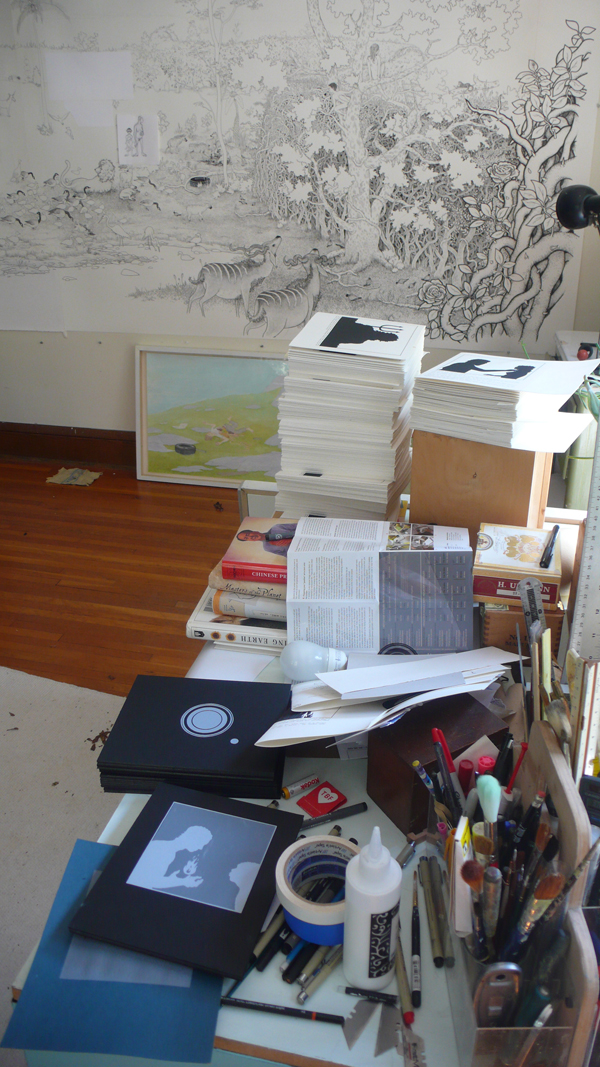 I haven't been drawing in my sketchbook much lately as the dearth of recent blog posts will attest. Instead I've been preparing for a show I'm putting up at the Elmhurst Art Museum outside Chicago in a couple of weeks. The show is mostly a drawing show and includes the largest drawing I've probably ever done, a 5' x 8' monstrosity with the above title, which can be seen, dimly, in the background of the photo on the left. In addition to the drawings I'll be showing one painting and a 28 foot long hand made accordian book called Rage of Poseidon. It compiles a number of stories adapted from my sketchbooks, all stories of familiar gods and angels, including those of Isaac and Abraham, The Devil, Leda and the Swan, and one where Jesus tries to pick up Aphrodite in a bar. The stories are coupled with silhouetted imagery, a configuration I came up with a few years back as a quick way to create a slide show from the Poseidon story for a reading when Joe Meno asked me to read with him for the release of his book Demons in the Spring. I ended up reading the pieces several more times including at stops on the tour for Big Questions when it turned out that slide readings of comics, especially long silent sequences of sad and sickly birds crawling around in the grass exchanging curious looks was a little awkward.