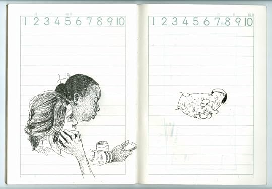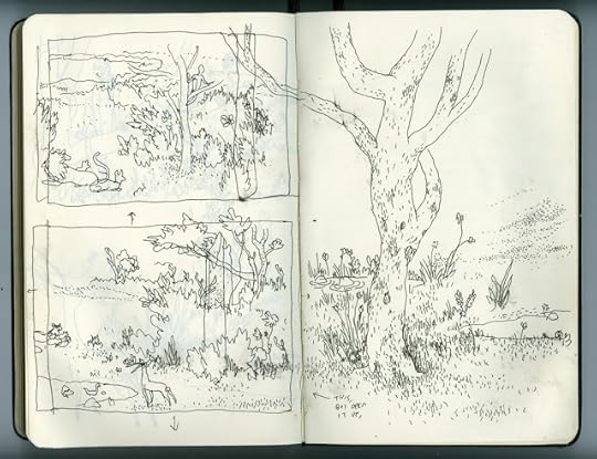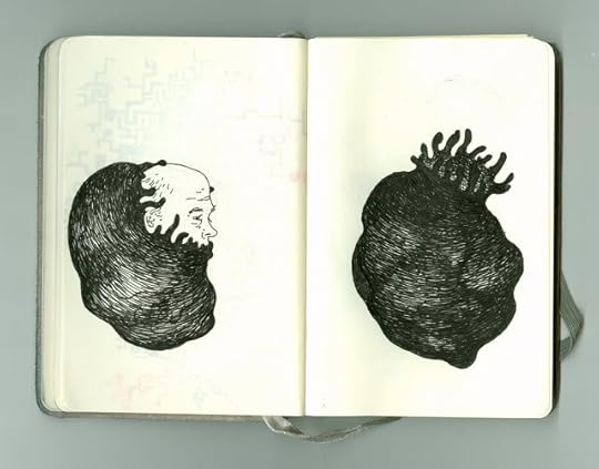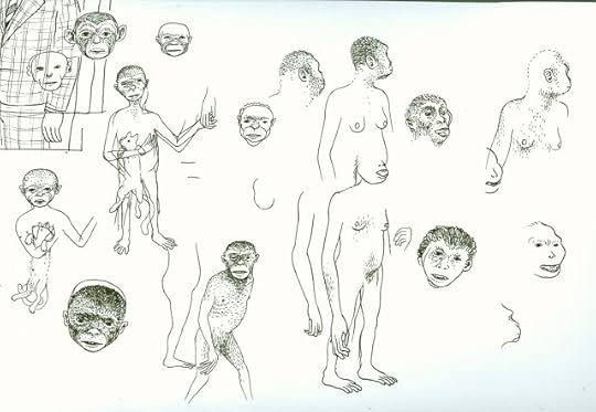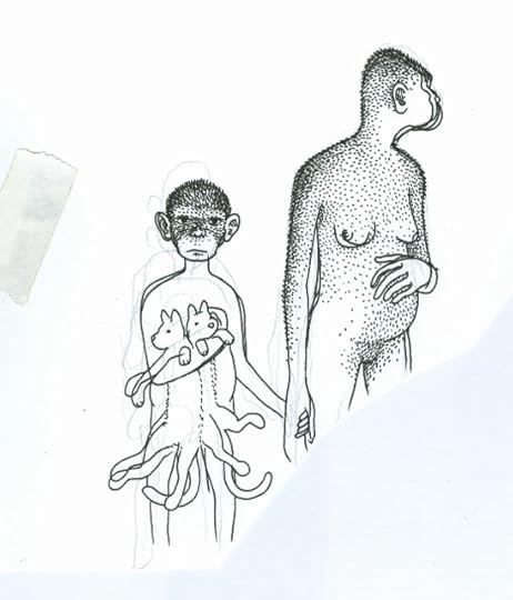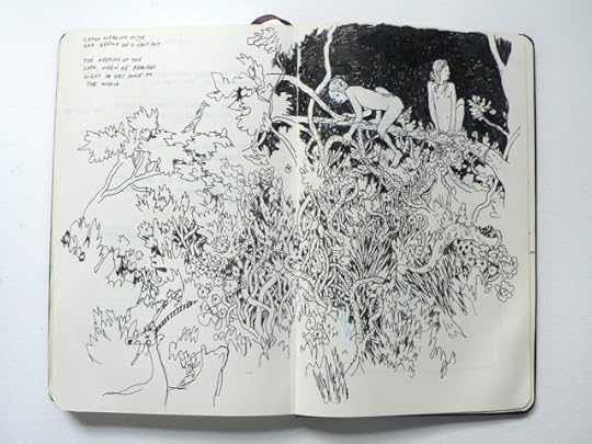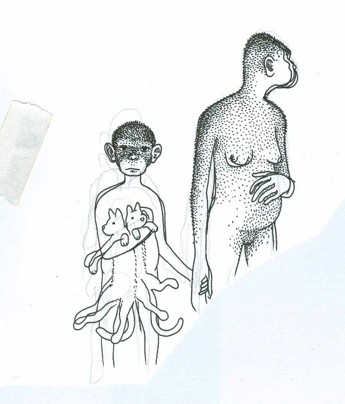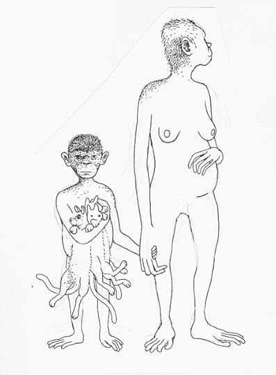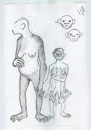 Making the accordian book has been as epic a wrestling match as figuring out how to make a 5'x8' drawing turned out to be when ones line is as thin and airy as mine. Between the two I feel like I'm being ground into the mat and getting my head stapled by Mickey Rourke. How do you fold a 28 foot piece of paper into 48 separate pages evenly? How do you keep the glue at the hinges from warping the paper? How do you attach the damn thing to its cover? I have been constantly reminded why I started out xeroxing drawings I didn't expect anyone to like on the cheapest paper I could find and stapling them together in a pile. It took an afternoon. In the process of making Rage of Poseidon I had to relearn how to screen print in order to make the covers (see above – the interior is archival pigment printing). I also found out that it's basically impossible to print accurately on both sides of a 44" piece of paper using an Epson 9880, but that it is possible to cut rolls of that paper on a chopsaw, though in the end that roll of paper turned out to be useless for other reasons.To close out the post I'm attaching a few images of studies for the big drawing. The first two are of Adam and Eve and the general composition. These are followed by a number of studies of some hominids who make their home in the garden. These two also show up in a story in the accordian book about Prometheus. I can't get enough of that little guy with the cats.