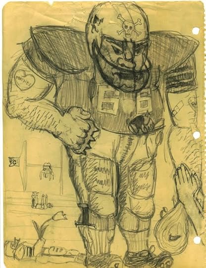 My father drew this in... 1966? It recently came to light in the collection of an old football buddy of his from college. He doesn't know it exists as I write this and probably won't see it until he opens his email tomorrow. I think it's amazing, although he might want me to mention that he spent considerably more time and care on some later efforts, which might also be worth a blog post at some point. But anyway... today is his birthday. Happy birthday, dad.