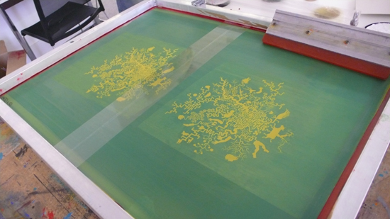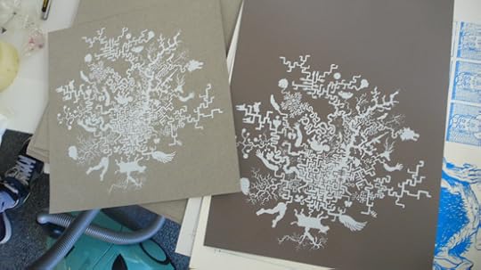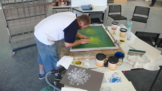 The magical awesomeness of Pierre Feuille Ciseaux is a little difficult to express. But one big part of it was the support staff which included a team of screen printers and a second team of woodcut/lino printers who basically didn't sleep the whole week while this gaggle of 20 enthusiastic, spoiled artists banged out images for them to print. Below is Nono indulging my extremely tightly registered two-color printing job.