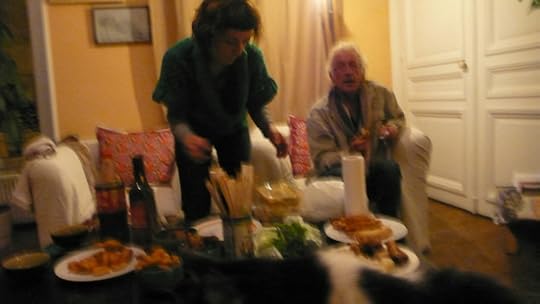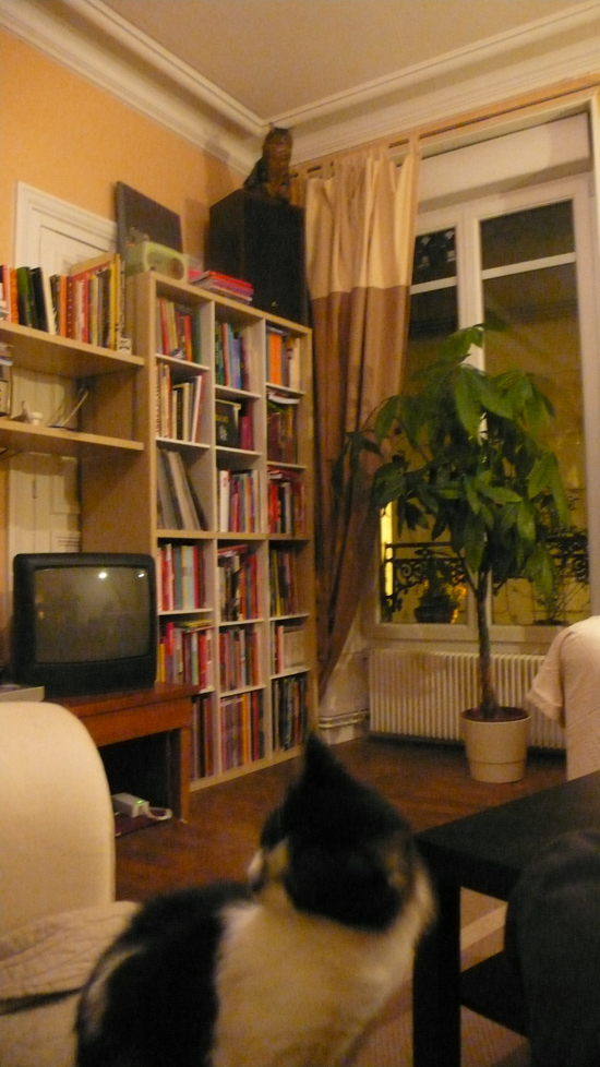 [image error] We got in late after a signing in Poligny and a few slight misadventures. The spread below is Chinese food from up the block. And the two cats above (both top and bottom) are Hercule (top) and...crap, I forgot the kittens name below. He was hilarious, though. Kept trying to follow Hercule up the shelf, but ended up each time collapsing down to the floor, dragging books and wires and various items down with him in a cascade. Look for him again in the next picture.