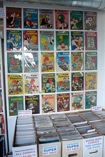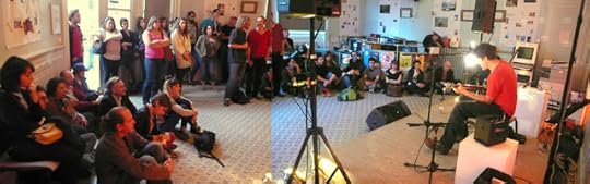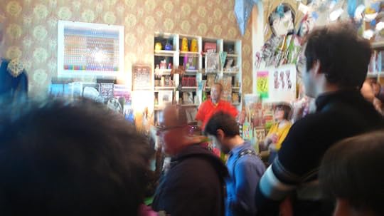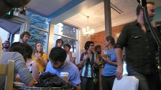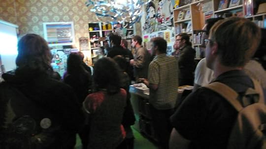So far I've been in Baltimore, Bethesda (at SPX), Pittsburgh, Philly, and, for the last four days, New York City. More about all the above to follow. Aside from a case of the famous Canadian cartoonist flu pandemic of 2011, it's been completely awesome. Being on the road with Marc Bell rules. That guy's awesome. Tonight I'll be in Providence at Ada Books. Below are a couple of photos from Pittsburgh. Bill at Copacetic put up a back issue wall for me to sign next to. It's all comics about birds. Awesome. Below that is a shot of people waiting for Marc and I to start.