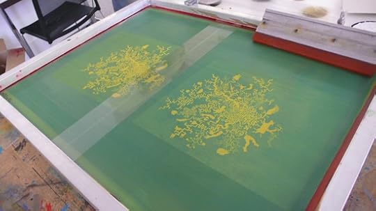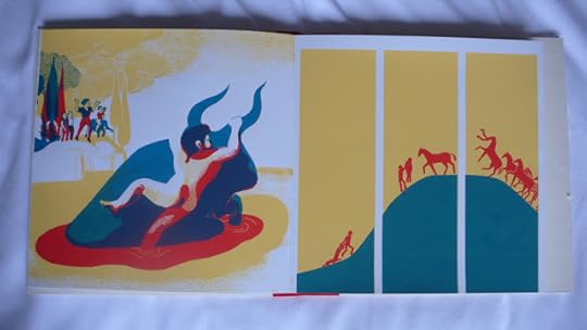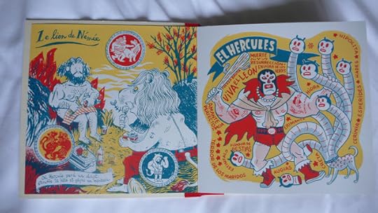 The main task of the screen printing/book-making team was to produce the book below. Almost everyone collaborated, starting on the first day, in doing a three color print based on one of the twelve labors of Hercules. Below is the cover, following are several spreads from the book.