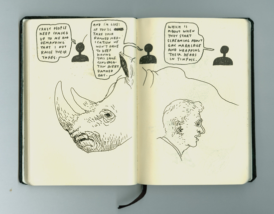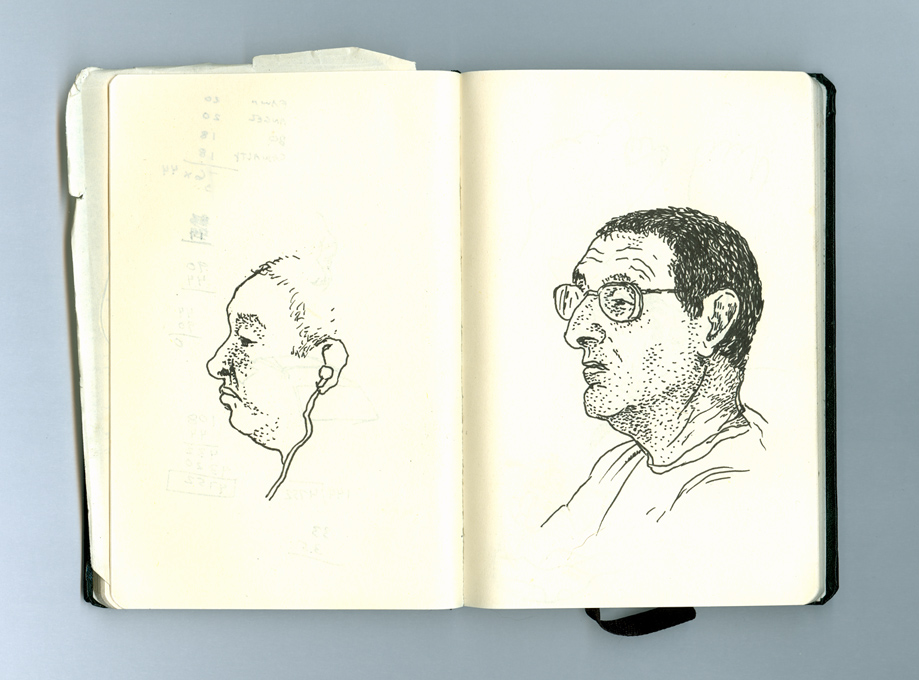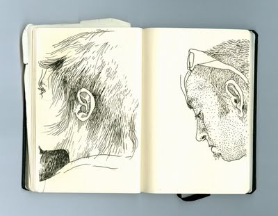 The first of these sketchbook spreads are two people with whom I shared the Megabus on my way back to Chicago from Minneapolis a couple of weeks ago. The other two feature drawings of people on the El.