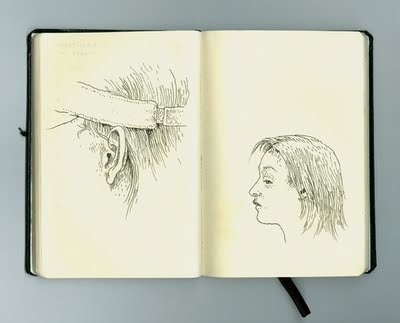 The last, left hand page, below: I was drawing the person sitting in the audience in front of me at Mark Bazer's Interview Show the other night, and then she turned out to be another guest on the show. Her name is Cameron Esposito. She's a comedienne. She was completely hilarious. This is her ear.
