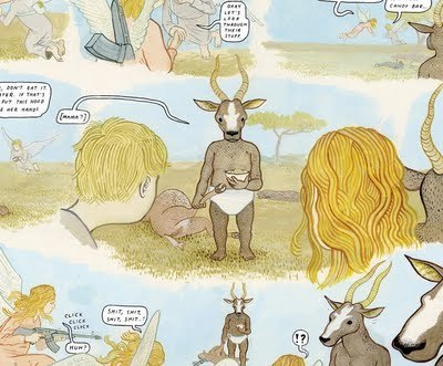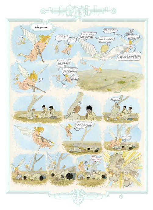 I recently reprinted The Game, the fully painted strip I contributed to the giant sized Kramer's Ergot #7. I'm releasing it as a folded up, two-sided poster. The original strip, as it appeared in Kramer's was three pages. The poster version includes a fourth page, a sort of extended ending that I left off the original for a variety of reasons. The strip will be available in various comic and specialty book stores, and is now available, also, here. For the first week or so postage will be free.