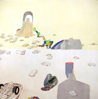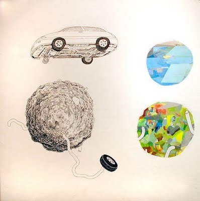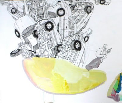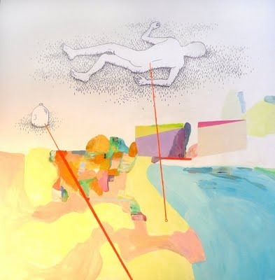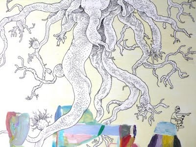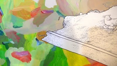 Over the last several weeks I have been busily drawing on top of a number of half finished paintings given me by Nick Butcher and Nadine Nakanishi of Sonnenzimmer. The opening reception for the resulting show is being held at Fill In The Blank Gallery this Friday, the 20th of May, from 7-11. above is an unfinished painting, below are details of several more. You can read more about what the hell we were thinking here. The process has been, by turns, a delight, an ordeal, an education... It has turned out to be a vigorous conversation–and at times a vicious internal argument–between abstraction and representation, between painting and drawing, and between playfulness and planning. Come listen in. 5038 N Lincoln Avenue in Chicago.