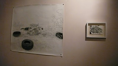 I just posted some info about the new show at Lula at the Lula's Walls blog and thought I'd put some of the images and the story of THE FLOOD here as well (see below). Following are installation shots of the show and then some of the individual pieces. I suggest clicking on Chi-hoi's drawing below (the textured cube) the text is awesome.