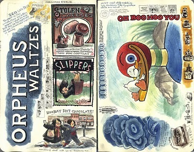 I'm not sure exactly how I came across Laura Park's amazing and beautiful sketchbooks on Flickr. As a Chicago cartoonist type I knew her, vaguely, as friends of friends, and had seen and admired her mini-comics. But they didn't prepare me for the breathtaking color comics and drawings in her sketchbooks. It was like peering down a rabbit hole in the woods and realizing it's filled with gold. Several of these will be on display in the bar cases at Lula through December, installed in time to be...