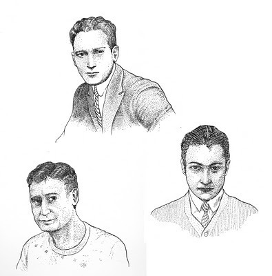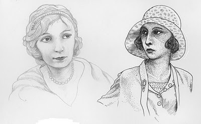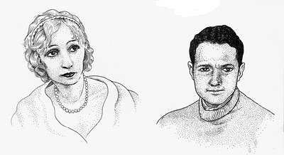 This summer I was asked to do a cover for the Great Gatsby for Penguin U.K. The idea was to reference old playbills from the twenties or thirties. I started out with very detailed portraits of 'the players' drawn from images I found of film stars of the time (Daisy here is Bessie Love, Tom is William Haines, most of the others are composites), the idea being that the drawings would recall vignetted, engraved portraits, also typical of the time.