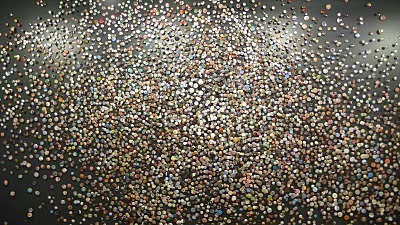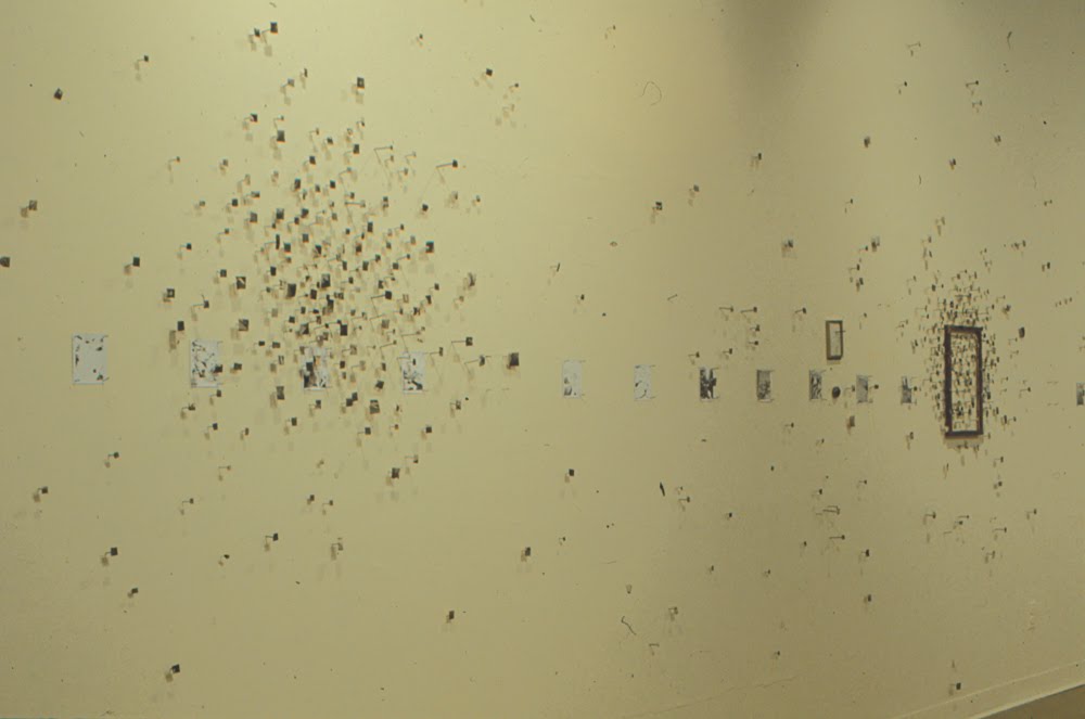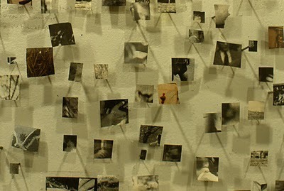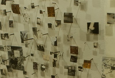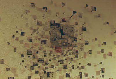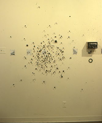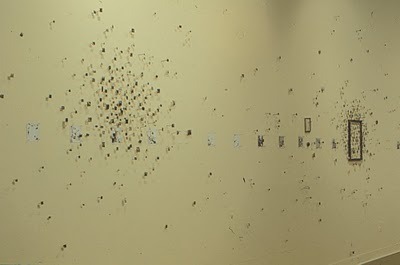 Following are some images from an installation I did as part of my thesis show before finishing undergrad in New Mexico. Before the buttons I simply glued cut out paper to nails. Not pictured: a chair I shot up and destroyed with a shotgun, then put back together and planted grass in. This show was the first incarnation of the work that has evolved into the recent button collage installation here. Returning the gallery to prior form involved hours and hours of spackling.