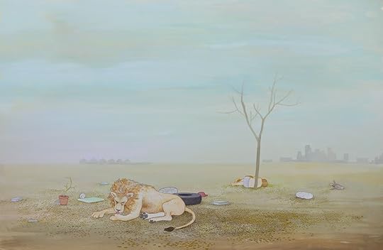 If you click through to the interview preview page you get to move a little magnifying glass around on Adam and Eve Sneaking Back into the Garden to Steal More Apples. Most of my work is probably ripping off Burns a little bit, but here's a painting I did several years back inspired directly by Dürer's various takes on St Jerome and the Lion (which also might be the first time I depicted Adam and Eve – that's them by the tree).