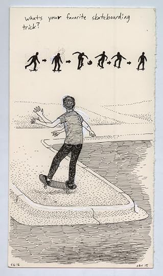 I am officially no longer accepting new submissions for Conversation Gardening for myself to draw. I'm going to be enlisting more guests to take over for me. I haven't counted the ones I've gotten so far, yet, but there's a big stack. Many of you who have sent me questions have probably noticed that it's taking me a while to get to them all. Hopefully they are worth the wait. But I promise: I am moving through them, so please be patient. Below are a few new ones. The first here is my initial attempt to answer the question in the one below (the opposite side of the paper). I thought it deserved a second go. The others are self-explanatory, I think... although perhaps it's worth saying, given that I'm not as good at drawing myself skateboarding as I was when I was 15, that that's supposed to be a frontside 180 to fakie manual.