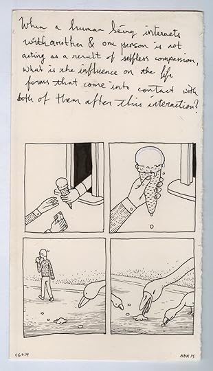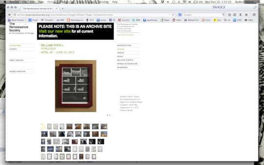 My friend Marianne emailed me the other day about something else entirely and mentioned that she'd seen a page from Big Questions reproduced as an artwork in a monograph of the artist William Pope L. I poked around on the internet a bit and found that a print of the page (400, in case you're interested – a nice round number) had been on display in his show, Forlesen, at the Renaissance Society at the University of Chicago a year and a half ago. On their site it looks like this: