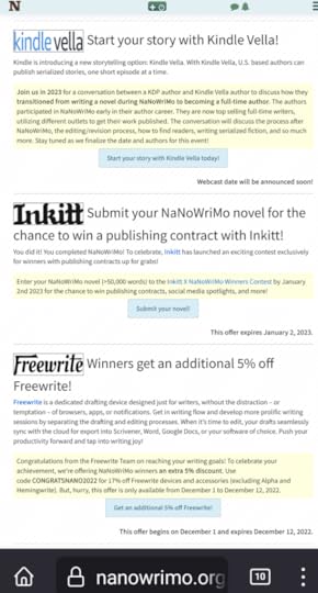 This year, when I punched in my final word count, I got the usual lovely confetti and charming winner video and the little heart reacts from the wonderful people in my local NaNo discord. I felt good. Until I clicked on the “winner goodies” section, which is a set of discounts available to winners for things like writing software, plotting software, and typing devices. Those are all great, even if they are a bit of free advertising for the companies offering the discounts.