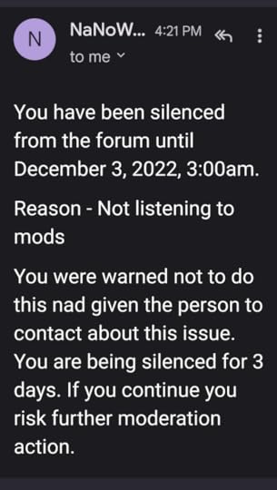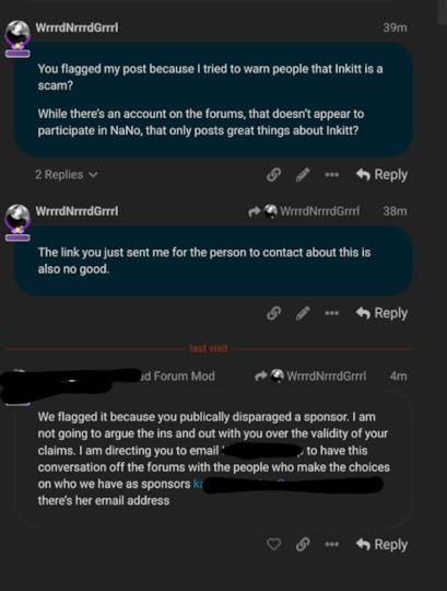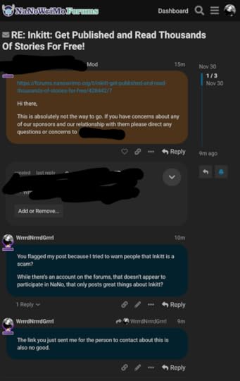 NaNoWriMo has dedicated forums. When I found Inkitt on my “winner goodies” page, I went to the forums to ask why this extremely disreputable company had been included and suggest that people google them before signing up. I would love to show you my original post, but a mod in the forums deleted it. Then that mod started sending me DMs.