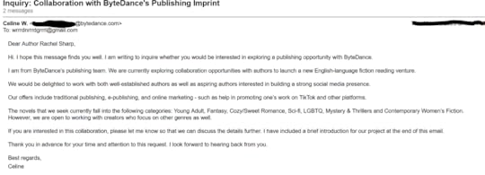 I got an email this week that appears to legitimately be from Bytedance’s “publishing imprint.” Reading it, I wondered how much of it was written by a human. It certainly wasn’t aimed at me by a human, because a human would have taken one glance at my public existence and realized that I was the worst possible target. To be completely honest, I responded to it because I want to see if a human reads the responses, and if so, what their reaction might be. And I’m posting the exchange here because it contains some advice for writers. It might even be a good exercise in spotting red flags. I enumerated a few of them. How many do you see?