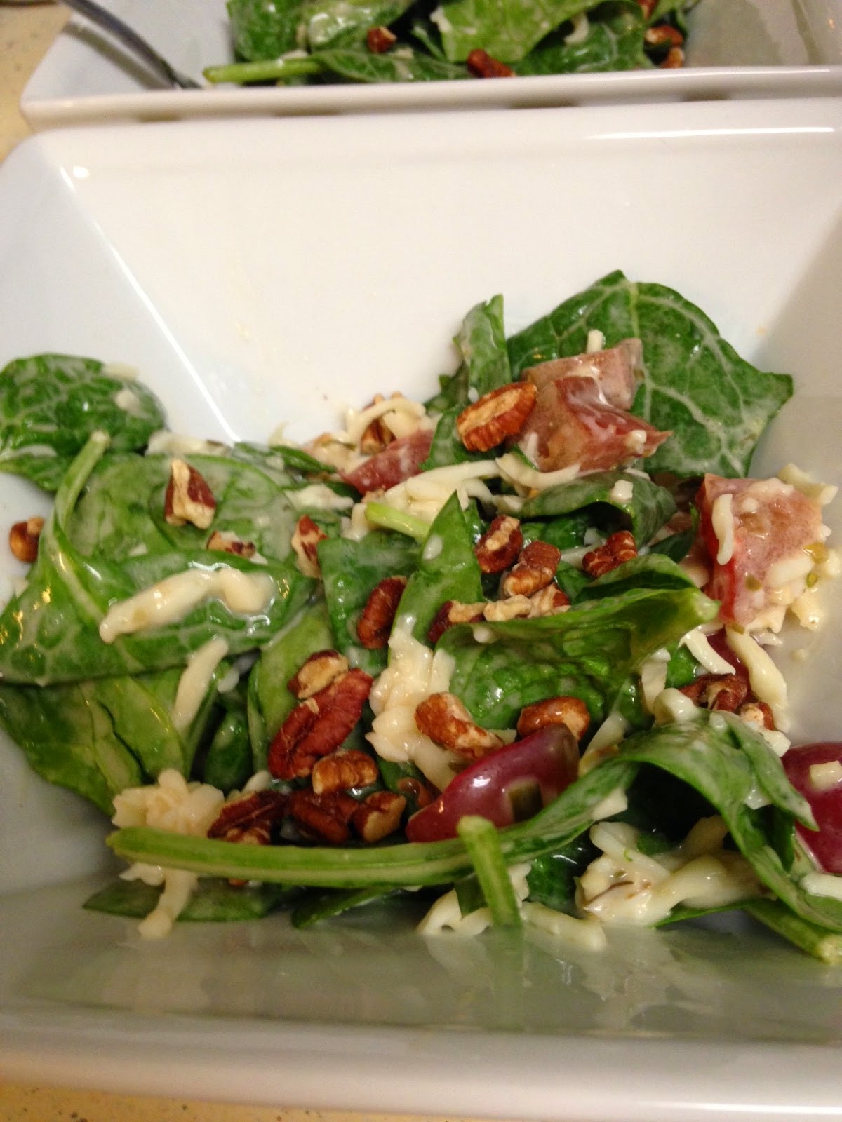 Slice the grapes in half (length-wise), cut the tomato (however thick you like it) and dump both into a bowl along with the spinach, cheese and crushed pecans. Add your dressing, cover the bowl with a tight lid and give it a very healthy shake - it is a tossed salad, after all! LOL!!!