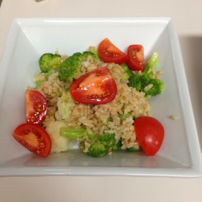 Once rice is cooked, transfer to a large mixing bowl. Add the olive oil, lemon juice, salt, pepper and mix well. Add the tomatoes (broccoli and cauliflower, if desired) and sprinkle with basil. Toss to combine and serve.