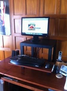 After thinking about it on and off for a few years, I finally took the plunge last night and set myself up with a standing desk at which I can write. In fact, I’m typing these words at it right now, and so far it’s all right. My feet hurt, but I’m told that goes away in a few days. I’m willing to stick it out to see if that’s true.