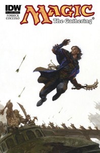 This is, I believe, the third cover for the Magic: The Gathering #1. Like many publishers, IDW gives out copies of its comics with rare variant covers to retailers who buy lots of copies of the book. This one is the rarest of the lot, and like the regular versions it should be in stores and on e-readers in December.