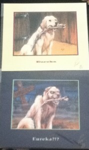 My son Marty's putting up more of my old stuff on eBay now that school's out. He just stumbled across a pair of art prints I'd forgotten I had. Paul (Prof) Herbert created this artwork for the Doomtown CCG back when I was still the president of Pinnacle. The first one features Eureka the dog holding a zombie arm with a pistol still in it. The second shows a zombie Eureka.