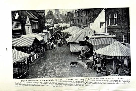 Pinner High Street, 1908 (without the fair present!)As a child growing up near Pinner, I used to walk into the village with my father to watch the rides being set up. The walk still is very pleasant, especially at this time of year with the trees in blossom, but it is essentially a stroll through suburbia, albeit with neat front gardens and well-to-do houses. Quite different from what met the visitor in the 1830's.'We used to go across the fields about four miles to Pinner.'Revd. Henry Torre
