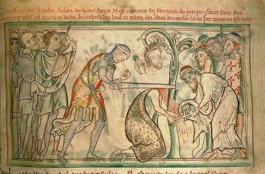 A rather grizzly depiction of Alban's executionAlban was sentenced to death, but on the day of his execution a number of miracles happened which made the executioner refuse to perform his duty. A second executioner was found who beheaded Alban, along with the first executioner - but then this second executioner was struck blind. Alban’s head bounced down a hill (Holywell Hill) and a stream arose where it landed. The place of Alban’s execution is reputedly where St Alban’s cathedral stands today.