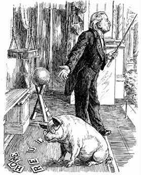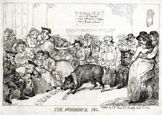 So convincing was the pig's performance that some religious people claimed he was possessed and 'corresponding with the devil'. Others saw it as proof that the soul could migrate suspecting that: 'The spirit of the grunting Philosopher might once have animated a man.'The act amazed the audience as the pig spelt names out with cardboard letters. Crowds flocked to see him and with four shows a day, was rumored to take the huge amount of 70 pounds a week in ticket sales. After a long Londonrun the pig joined a circus performing at Sadler's Wells Theatre. A group of acrobats, incensed at being asked to share a billing with a performing pig, threatened to resign and were sacked on the spot. By 1786, in the world of entertainment the Learned Pig ruled."A far greater object of admiration to the English nation than ever was Sir Isaac Newton." Robert Southey