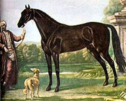 Published London, 1857Now this is the amazing fact!!! Breed histories generally focus on one of three stallions, which are referred to as the “foundation sires.” These stallions are Byerley Turk (foaled c.1679); the Darley Arabian (foaled c.1700), and Godolphin Arabian (foaled c. 1724).The three founding fathers of the turfFollowing the family tree of the Godolphin Arabian, the Byerley Turk and the Darley Arabian is rather like compiling a ‘who’s who’ of racing champions!The Godolphin Arabian**Foaled about 1724 **Probably exported from Yemen via Syria to the stud of the Bey of Tunis **Initially given to Louis XV of France in 1730, he was then imported to Britain **Sired the best racehorse of the day, called Lath **The Godolphin Arabian’s line hasn’t won the Derby since Santa Claus in 1964, and has recently been overshadowed by the Darley Arabian’s descendantsThe Byerley Turk**Foaled about 1680 **His line includesDescendent Highflyer and his sons were champion stallions 23 times in 25 years