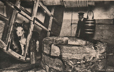 Postcard of the donkey working the treadmill at Carisbrooke CastleIt seems likely the treadmill was originally powered by prisoners, but in 1696 a visitor recorded:“Water was drawn by a horse or ass.”From then on specially trained donkeys were kept at the castle, to walk inside the wheel and winch up buckets of water. To this day, tourists can visit the well house and watch the donkeys at work (although, in case you were wondering, the castle is now connected to the mains.)