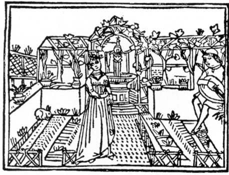 A woodcut of a woman in a medieval kitchen gardenThough Judith’s lovely post goes on to discuss women and the garden as a literary device, at this point I was temporarily lost in the beauty of imagined gardens. This kind of beauty seems to be a part of us all—who doesn’t visit a garden from time to time or if given the time and resources, surround their home with greenery and colorful blooms?